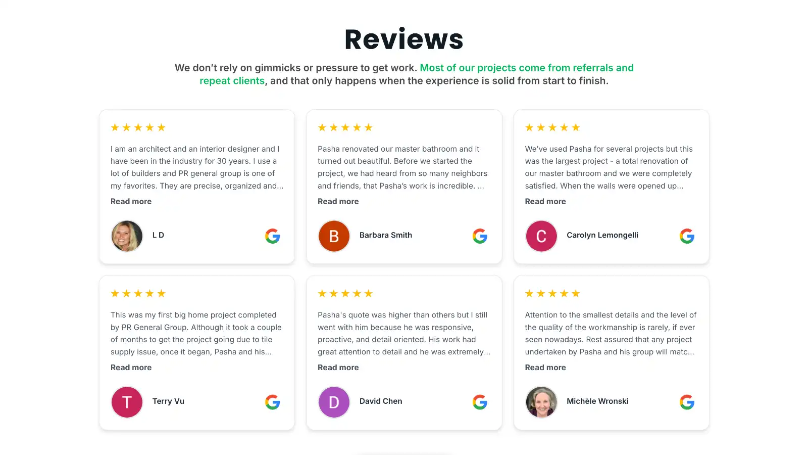 Homeowners choose contractors they trust. Your site should build that trust in three seconds flat — reviews, process, real photography, and a clear reason to pick you over the other guy.